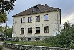 Das zweigeschossige Wohnhaus wurde 1937/1938 an der Stelle des vormaligen Gutshauses errichtet. Der Grundriss des Gebäudes ist annähernd quadratisch. Es erhebt sich, für die Umgebung ungewöhnlich, auf einem Sockel aus Rogenstein. Zum Eingang führt eine kleine Freitreppe, deren Wangen ebenfalls aus Rogenstein gefertigt sind.