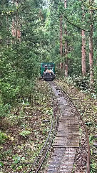 Die Hauptstrecke vom Hafen Awa (安房) bis zum Kosugi-Tal wurde 1923 eröffnet. Sie wurde von dem Forstamt Yaku, das dem Forstamt Kumamoto untergeordnet war, betrieben. Seit Mai 1969 wird die Schmalspurbahn nicht mehr zum Transport von Langholz genutzt, sie wird aber noch als Werksbahn eines Wasserkraftwerks eingesetzt.[1] Unter anderem werden damit Fäkalien eines Toilettengebäudes entsorgt. Außerdem werden auf ihr gelegentlich ausgegrabene Baumstümpfe der Yakusugi-Zedern transportiert, die im Handwerk, für die Möbelherstellung und als Baumaterial verwendet werden.