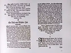 - ↑ Otto Holzapfel: Folkevise und Volksballade. Die Nachbarschaft deutscher und skandinavischer Texte. Wilhelm Fink, München 1976, S. 19 f. ISBN 3-7705-1301-0. - Man vergleiche die Abbildung, im Faksimile S. 77: [linke Spalte:] „Ein Lied über Meister Hildebrand. Es lässt sich vermuten, dass dieser Meister Hildebrand auf vielen Kriegszügen dabei gewesen ist und seit seinen jungen Jahren überall herumgewandert ist und will nun in den Tagen seines Alters wieder nach Hause ziehen … trifft er seinen eigenen Sohn Herr Allebrand … ein harter Kampf zwischen Vater und Sohn … der Sohn ergibt sich und wird vom Vater mit großer Freude erkannt …“ (im Gegensatz zum alten Hildebrandslied mit tragischem Ausgang hier ein glückliches Ende). Es folgen Erklärungen u. a. über Bern = Verona, «soll hier [dem folgenden Liedtext nach] in Griechenland liegen». Das erklärt Vedel mit dem antiken „Groß-Griechenland“ in [Süd-] Italien] und über die Bezeichnung „Meister“, die «in Frankreich und in Holland bis heute» für «Hauptmänner und kluge Männer» verwendet wird. Es folgt die erste Strophe (von insgesamt 20 Strophen) des Liedes: „Ich will mich zu Land ausreiten, das sagte Meister Hildebrand: Wer mir den Weg will weisen nach Bern in Griechenland. Dieser ist mir unkundig [unbekannt] geworden in so vielen guten Tagen: in drei und dreißig Jahren sah ich nicht Frau Judte.“
