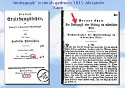 Die erste Nennung des Begriffs Andragogik findet sich in Alexander Kapps Platon’s Erziehungslehre, als Pädagogik für die Einzelnen und als Staatspädagogik von 1833[1]. Neu erfunden wurde der Begriff dann in den 1920er Jahren – so bei Eugen Rosenstock[2] und bei Werner Picht,[3] Robert von Erdberg und Wilhelm Flitner – allerdings mit jeweils unterschiedlichen Konnotationen.