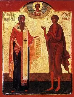 Auf Ikonen und anderen bildlichen Darstellungen des Heiligen erscheint dieser in Bischofsgewändern mit Buch oder Schriftrolle und segnend erhobener rechter Hand sowie mit grauen Haaren und langem grauem Bart.