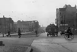 ↑In Mietshäusern mit engen Hinterhöfen wohnten Arbeiter, gering bezahlte Angestellte und Beamte niedriger Dienstränge. Schon seit 1943 war es ein Ziel alliierter Luftangriffe und im Frühjahr 1945 war hier Hauptkampfgebiet der „Schlacht um Berlin“.