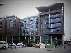 Andreasstraße 10: „City Carree II“[81] (117016): Auf dem Geviert Andreas- / Lange / Koppenstraße / Stadtbahn stand um 1990 noch das Schulgebäude. Mit der Nähe zum Ostbahnhof wurde ab 1992 auf der Brachfläche der flächendeckende Bürokomplex aus Büro-, Hotel- und Einkaufsensemble geplant.[82] Im Herbst 1996 eröffnete das „City Carree“[83] an der Koppenstraße 93[84] mit einer Passage.[85][86] Zum Gesamtkomplex gehört das mit Lange Straße 31 adressierte Hotel. Für diesen Teil wurde das vorhandene Gebäude der aufgegebene (Berufs-)Schule um ein zusätzliches Geschoss erhöht und in die Architektur eingegliedert. Dadurch entstand ein trotz Bahnhofsnähe ruhiger Innenhof. 1998 folgte eigenständig das Büro- und Geschäftsgebäude „City Carree II“ Bürogebäude mit 28.500 m² Bruttogeschossfläche an der Andreasstraße 10 (Lange Straße 30),[87] in dem Einrichtungen der Bahn und der Deutschen Telekom unterkamen. Das achtgeschossige Bürogebäude an der Andreasstraße mit einer Gesamtmietfläche von 15.755 m² wurde in Teilbereichen 2010–2012 modernisiert. Die Eigentümer wechselten seit dem Bau. Der gesamte Gebäudekomplex im Karree umfasst eine Grundstücksfläche von 14.500 m² mit drei Gebäudeteilen: einem Bürohaus (City Carree II) Andreasstraße 10 (Lange Straße 30), dem Hotel (Novum Select) Langestraße 31 und dem Büro- und Handelshaus (City Carree) am Ostbahnhof mit der Adresse Koppenstraße 93.
