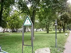 ↑Ein Spielplatz für Kinder bis 14 Jahre in sonniger Lage bietet Spiel- und Klettergeräte und zwei Sitzbänke im Schatten unter Bäumen. Hunde sind verboten. Er liegt auf den beräumten Grundstücken 23–25.
