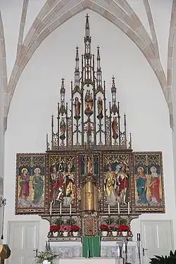 - Die Pfarrkirche St. Valentin besitzt teilweise Bausubstanz aus dem 13. Jahrhundert. Auch einige Fresken aus jener Zeit sind in der Sakristei noch erhalten. Anton Psenner schuf 1864 die Seitenaltarbilder.[10]