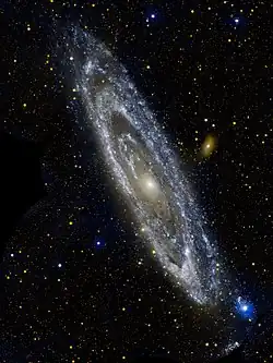 | Bild der Andromeda mit sichtbarem Licht, sichtbar sind zusätzlich die Satellitengalaxien Messier 32 oberhalb und Messier 110 unterhalb des Galaxiezentrums | |