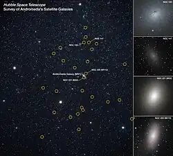 Ende des 18. Jahrhunderts fielen Charles Messier während einer Beobachtung des Andromedanebels im Sichtfeld seines Teleskops zwei weitere Nebel auf, die den Andromedanebel zu begleiten schienen.[68] Nachdem Edwin Hubble Anfang des 20. Jahrhunderts die Entfernungsbestimmung mittels Cepheiden gelang, stellte er fest, dass diese drei Objekte auch in der dritten Dimension des Raumes, in Sichtrichtung, nahe beieinander liegen: Sie sind damit Mitglieder der von ihm gefundenen Lokalen Gruppe von Galaxien, in der die Andromedagalaxie mit diesen zwei Begleitgalaxien Messier 32 und NGC 205 ein untergeordnetes System bilden.[69] Sidney van den Bergh erkannte im Jahr 1968, dass weitere zuvor bekannte Galaxien dem Andromeda-System zugeordnet werden können, namentlich NGC 147, NGC 185 und der Dreiecksnebel (M33).[70] Kurz darauf fand van den Bergh mit Hilfe eines speziellen Teleskops mit weitem Sichtfeld und besonders empfindlicher Fotoplatten vier weitere, zuvor unbekannte Galaxien und bezeichnete sie mit Andromeda I–IV.[71] Mit dieser Kombination von Teleskop und Fotoplatten wurde in den 1980er und 1990er Jahren eine großräumige Himmelsdurchmusterung durchgeführt, in der im Jahr 1998 die Satellitengalaxien Andromeda V, VI und VII gefunden wurden. Nachfolgende Untersuchungen mithilfe des Hubble-Weltraumteleskops zeigten umgekehrt, dass Andromeda IV weiter entfernt ist und nicht zur lokalen Gruppen gehört.[72]