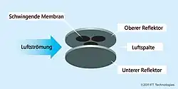 In dem Hohlraum befinden sich mehrere schwingende Membranen, die akustische Ultraschallwellen erzeugen und empfangen. Durch die wiederholte Reflexion zwischen den Reflektoren wird eine quasi-stehende Welle senkrecht zur Windrichtung und eine Transversalwelle parallel zur Windrichtung erzeugt. Strömt Luft entlang der Achse zwischen den Reflektoren, beeinflusst das die Ausbreitungsgeschwindigkeit der Welle und erzeugt eine Phasenverschiebung, die gemessen wird. Zum Ausgleich von Änderungen der Schallgeschwindigkeit, zum Beispiel durch Temperaturänderungen, wird die Ultraschallfrequenz kontinuierlich so angepasst, dass der Hohlraum in Resonanz betrieben wird. Dadurch wird die Messung der Luftgeschwindigkeit unabhängig von der variablen Schallgeschwindigkeit.