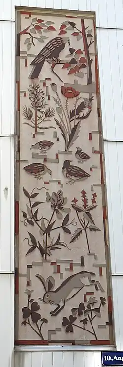 Am Wohnhaus befindet sich ein Mosaik mit Tierdarstellungen aus dem Jahr 1963, das mit den Initialen HP bezeichnet ist.