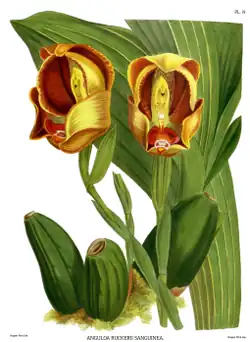 - Anguloa ×ruckeri Lindl.: Sie kommt in Venezuela vor und die Eltern sind Anguloa clowesii × Anguloa hohenlohii.
