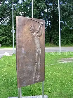 Die Stele wurde im Juni 2008 im Beisein von Bernhard Langer und Bürgermeister Otto Völk eingeweiht. Anlass war der 50. Geburtstag des Golfprofis (geboren am 27. August 1957 in Anhausen). Gestaltet wurde das Werk von dem Anhauser Künstler und Bildhauer Friedrich Brenner. Die Stele zeigt auf drei Seiten den Golfer bei seinem Sport. Seite 1 würdigt den sechsfachen Deutschen Meister, Seite 2 verweist auf die US-Masters-Siege, Seite 3 erinnert an den Einsatz beim Rydercup. Der Platz um die Stele und die Mehrzweckhalle erhielt den Namen „Bernhard-Langer-Platz“.