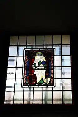 Die 49 cm hohe und 36 cm breite Scheibe (ohne die modernen Randstreifen) ist der untere Teil eines Lanzettfensters an der Westfassade, das durch den Einbau der Empore im mittleren Bereich zugemauert wurde. Sie ist in eine einfache Rechteckverglasung eingesetzt worden und von einem farblosen Randstreifen eingefasst.