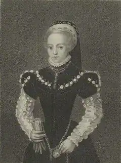 - ↑ Agnes Strickland: Lives of the Tudor Princesses including Lady Jane Gray and her Sisters. 1868 Longmans, Green and Co., London, S. 243: “I have presumed by letter to renew my suit for my son to the queen’s majesty and have likewise written to my Lord of Leicester, praying you to set in your helping hand to end this tedious suit […] her highness’ displeasure is too long lasting […] how unmeet it is this young couple should thus wax old in prison […] how far better it were for them to be abroad and serve the queen.”