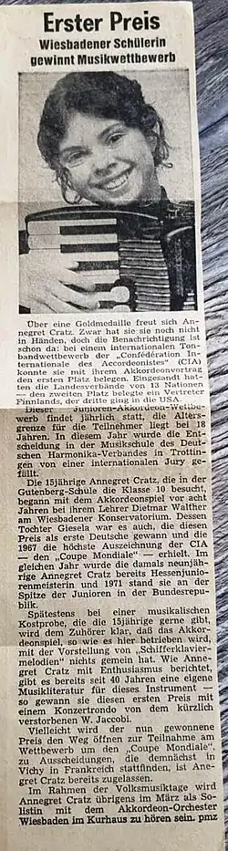 Im selben Jahr nahm Annegret Cratz am internationalen Tonbandwettbewerb der CIA (Confédération Internationale des Accordéonistes) teil. Das von ihr eingereichte Tonband wurde zunächst in Deutschland nominiert, um danach in Neuseeland an der Endausscheidung teilzunehmen. Gegen die Konkurrenz der aus 13 Nationen eingeschickten Bänder konnte sie diesen weltweiten Wettbewerb für sich entscheiden. Daraus folgte eine Einladung zum Coupe Mondiale, der im selben Jahr (1973) in Vichy/Frankreich stattfand. Dort durfte sie sich als Jugendpreisträgerin im Fest- und Abschlusskonzert präsentieren.
