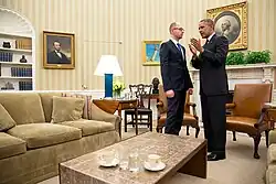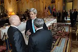 Am 21. Februar 2014, nach der Eskalation der Euromaidan-Proteste, unterzeichnete der ukrainische Präsident Wiktor Janukowytsch eine Vereinbarung zur Beilegung der Krise mit den Oppositionsführern Vitali Klitschko, Oleh Tjahnybok und Arsenij Jazenjuk. Die von den Außenministern Deutschlands, Polens und Frankreichs, Frank-Walter Steinmeier, Radosław Sikorski und Laurent Fabius vermittelte Vereinbarung sah neben der Entwaffnung rechtsextremer Milizen[33] auch eine Rückkehr zur Verfassung von 2004, die Bildung einer Regierung der nationalen Einheit und eine vorgezogene Präsidentschaftswahl vor.[34] Obwohl Putin den Westen später scharf dafür kritisierte, das Abkommen ausgesetzt zu haben, wurde es vom russischen Vermittler Wladimir Lukin nicht unterzeichnet. Lukin deutete an, Putin habe die Vereinbarung nicht gebilligt. Der „Maidan-Rat“ stimmte dem Abkommen mit 34:2 Stimmen zu, dieses wurde am nächsten Tag von der auf dem Maidan versammelten Menge jedoch abgelehnt und Janukowytsch wurde von einem Redner ein Ultimatum gestellt, bis spätestens am nächsten Tag zurückzutreten. In der Folge verließ ein großer Teil der Polizei und der Sicherheitskräfte ihren Posten.[35][36]