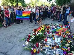 Weltweit kondolierten Repräsentanten vieler Staaten.[44] In Paris wurde der Eiffelturm[45], in Tel Aviv das Rathaus, in Sydney die Harbour Bridge, in New York City das One World Trade Center, in Bogotá der Torre Colpatria und in Berlin der Berliner Fernsehturm sowie das Brandenburger Tor in Regenbogenfarben angestrahlt. Im Nachhinein wurde die Beleuchtung am Torre Colpatria wieder abgeschaltet, als sich mehrere tausend Menschen gegen die Beleuchtung eingesetzt haben.[46]
