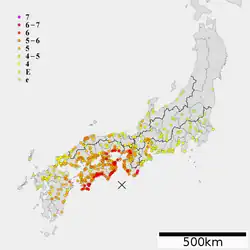 | Ansei-Nankai-Erdbeben 1854 | 安政南海地震 | 24. Dez. 1854[6] | 8.4 MK | Viele[7] | |