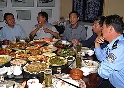 In China ist es heute verbreitet, eine Mahlzeit nicht aufzuessen.[113] Eine Studie aus den 2000er Jahren gab an, dass 81 Prozent der Teilnehmer sich so verhielten.[114][115] Als popkulturelles Beispiel für Missverständnisse zwischen Europäern und Chinesen wird häufig ein Werbespot der britischen Bank HSBC aus dem Jahr 2003 angeführt.[116][117] Darin wird ein Brite bei einem Geschäftsessen mit chinesischen Geschäftspartnern in einem Restaurant gezeigt. Er bekommt eine Schüssel mit Aalsuppe, die er vollständig aufisst, obwohl es ihn Überwindung kostet. Als die Geschäftspartner bemerken, dass die Schüssel leer ist, geben sie der Küche ein Signal für Nachschlag. Eine noch größere Schüssel wird serviert, und die Szene wiederholt sich erneut, bis der Werbespot mit dem verzweifelten Gesicht des Europäers endet, der sieht, wie mehrere Kellner einen noch größeren Aal bringen. Die Off-Stimme sagt: „Die Engländer glauben, es ist eine Beleidigung für das Essen ihres Gastgebers, wenn sie ihren Teller nicht aufessen. Die Chinesen haben dagegen den Eindruck, dass sie ihre Großzügigkeit infrage stellen.“ („The English believe it is a slur on your host’s food if you don’t clear your plate. Whereas the Chinese feel you are questioning their generosity if you do.“)[118]