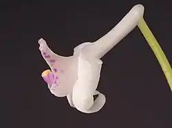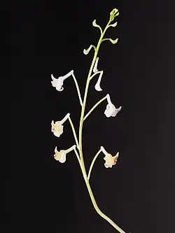 Mehrere aufrechte, kahle Blütenstände erscheinen seitlich aus der Sprossachse und überragen die Laubblätter. Die Blütenstandsachse ist weißlich, hell-grün oder bräunlich, mit mehreren bräunlichen, den Stängel umfassenden Hochblättern besetzt. Der meist traubige, seltener wenig verzweigte Blütenstand, enthält vier bis acht Blüten. Die rötlichen, später braunen Tragblätter sind bei einer Länge von etwa 4 Millimetern oval bis lanzettlich mit spitz zulaufendem oberen Ende. Fruchtknoten und Blütenstiel messen zusammen 1,5 bis 2 Zentimeter, der Fruchtknoten weist nach oben, die Blütenhülle leicht nach unten. Die Blüten sind nicht resupiniert und rosafarben bis fast weiß. Die Sepalen sind lanzettlich geformt, in ihrer unteren Hälfte für etwa 7 Millimeter miteinander verwachsen und eine Röhre bildend, im vorderen Teil frei und ausgebreitet. Die seitliche Petalen (16 Millimeter × 2 Millimeter) sind ebenfalls an ihrer Basis miteinander verwachsen, spatelförmig, der vordere Teil ausgebreitet bis zurückgeschlagen. Die Lippe ist etwa 16 Millimeter lang und an der Basis ist mit der Säule verwachsen, dort ist sie keilförmig verschmälert, der vordere Teil dagegen ist breiter und dreilappig. Die Lippe ist längs mit einer dunkel-roten Zeichnung versehen. Die etwa 16 Millimeter lange Säule ist weiß bis rosafarben und am oberen Ende gekrümmt. Das Staubblatt ist gelb, es enthält vier Pollinien in zwei Theken. Die Pollinien sind weich, sie besitzen weder Stielchen noch Klebscheibe.