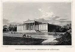 Im Zentrum des Giebelfelds steht die Bavaria, als Mittelakroter des Giebeldaches ziert hingegen ein Phönix den Bau. Mit einer hohen Freitreppe erhebt sich das Gebäude unter dem Portikus über den Platz. Es ergänzte das durch Architekt Leo von Klenze ab 1815 am Königsplatz geschaffene klassizistische Forum und diente zunächst unter dem Namen Kgl. Kunstausstellungsgebäude am Königsplatz[1] als Kunst- und Industrie-Ausstellungsgebäude. An der Südseite des Gebäudes wurde im gleichen Zug das Kloster St. Bonifaz errichtet.