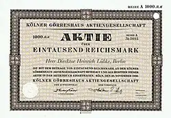 Die Görreshaus GmbH war 1926 aus dem Verlag der Kölnischen Volkszeitung hervorgegangen. Ihre Gesellschafter Generalkonsul Heinrich Maus, Konsul Julius Stocky und Hugo Mönnig tätigten erhebliche Investitionen, um sie zum bedeutendsten katholischen Verlagshaus in Deutschland auszubauen. Ab 1929 war das Unternehmen im Zuge der Weltwirtschaftskrise in finanzielle Schwierigkeiten geraten,[13] im September 1930[14] wurde es zum Ausgleich erheblicher finanzieller Verluste in eine Aktiengesellschaft umgewandelt.[15] Am 1. Mai 1933 meldete es, nachdem spätestens infolge der nationalsozialistischen Machtergreifung die bisherigen Geldquellen des Reiches, der Zentrumspartei und privater Spender versiegt waren,[16] Konkurs an.[17]