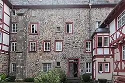 Das gegenüberliegende Gebäude auf der Südseite an der Rosengasse stellt seit dem Umbau ab 1577 den Kernbau des „Schlosses“ dar. 1569 hatte Landgraf Ludwig IV. das ehemalige Kloster zum Witwensitz seiner Gemahlin Hedwig bestimmt. 1577 bis 1582 entstand unter der Oberaufsicht des landgräflichen Baumeisters Ebert Baldewein der dreigeschossige Wohnbau auf älteren Resten.[2] Nach dem Tod Hedwigs im Jahre 1590 wurde es Witwensitz der zweiten Gemahlin Ludwigs, Maria von Mansfeld vorgesehen. 1594 erfolgte ein zweiter Umbau. Es entstand eine hölzerne Wendeltreppe in einem Anbau mit zwei vorkragenden Fachwerkobergeschossen an der östlichen Schmalseite. Ebenso die beiden zur Straße gerichteten zweigeschossigen Fachwerkerker. Diese werden von Volutengiebeln bekrönt. Der östliche Erker trägt in seiner Schwelle die Inschrift: „1594 MEISTER HANS KRAVSKOPF VON KIRCHFERS IM GERIT LORA DISEN BAV GEMACHT“. An der Hofinnenseite eingemauert steht in vertieftem Feld die Figur eines Mönchs mit dem Antoniterkreuz auf der Brust; er hält zwei Wappenschilde, das hessische und das mecklenburgische. An der Innenseite des Schlosshofs befindet sich der Grabstein des Präzeptors Conrad von Angersbach von 1477.