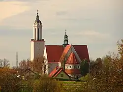 An der Kirche befindet sich ein Denkmal aus Muschelkalkstein für die gefallenen Soldaten des Ersten Weltkriegs aus Richtersdorf mit einer Skulptur des Heiligen Georg. Das Denkmal wurde vom Gleiwitzer Bildhauer Hanns Breitenbach geschaffen. An der Säule des Denkmals befanden sich mehrere Inschriften, darunter die Namen der 160 Gefallenen. Die Einweihung fand am 21. Juni 1931 statt.[2] Die Inschriften wurden alle nach 1945 ausgeschlagen. In neuer Zeit wurde das Denkmal restauriert und ein Teil der Inschriften wiederhergestellt.