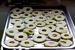 Die Äpfel werden gewaschen, geschält und nach Ausstechen des Kerngehäuses in gleichmäßige, etwa 1 cm dicke Scheiben (Ringe) geschnitten. Um das Braunwerden zu verhindern, werden die geschnittenen Äpfel meist mit etwas Zitronensaft beträufelt.[4] In einigen traditionellen Rezepten werden die Apfelscheiben stattdessen sowie zur zusätzlichen Aromatisierung mit Obstler beträufelt und mindestens zwei Stunden ziehen gelassen.[1]