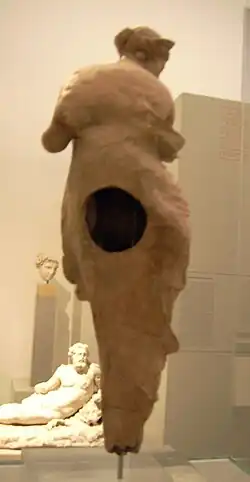 Die Darstellung der aus Terrakotta hergestellten Aphrodite gilt als besonders sinnlich und qualitativ herausragend. Das Gewand aus einem dünnen Stoff ist über die rechte Brust gefallen, auch sonst zeigt es mehr als es bedeckt. Vor allem im Bereich des Unterleibs liegt es sehr eng an und lässt die Körperkonturen recht genau erkennen. Da Arme und Beine abgebrochen und nicht erhalten sind, somit erklärende Attribute nicht erkennbar sind, kann die genaue Haltung der Figur nicht endgültig befriedigend geklärt werden. Da die Göttin den Kopf von den Gegenständen, die sie in der Hand hielt, wegwendet, ist es anzunehmen, dass zu ihrer Rechten eine weitere Figur, wahrscheinlich ein kleiner Eros, zu ergänzen ist. Das hochgestellte linke Bein lässt eine Basis oder eine größere Konstruktion wie einen Pfeiler vermuten. Das Haar der Aphrodite ist am Hinterkopf zusammengefasst und wird von einem Diadem gekrönt.