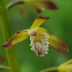 Der Blütenstand erscheint seitlich aus der Sprossknolle. Der Blütenstandsstiel ist von röhrenförmigen Hochblättern umhüllt. Die Tragblätter sind klein (drei bis sieben Millimeter lang) und zugespitzt. Die resupinierten Blüten sitzen in einer lockeren, vielblütigen Traube. Die Blütenblätter sind grünlich oder gelblich gefärbt und etwas bräunlich-rot überlaufen, nur die Lippe ist weiß mit rötlicher Zeichnung. Die Sepalen sind weit ausgebreitet, die Petalen weisen parallel zur Säule nach vorn. Die Lippe ist dreilappig, die Seitenlappen stehen aufrecht, der mittlere Lappen ist größer und endet stumpf mit gewelltem Rand. Am Grund der Lippe sitzen drei längs verlaufende fleischige Schwielen. Die Säule ist länglich geformt, sie trägt am Ende die konkav eingesenkte Narbe und das Staubblatt. Dieses enthält vier Pollinien, die über ein Stielchen (Hamulus) mit der Klebscheibe (Viscidium) verbunden sind. Die Kapselfrucht ist oval, etwa 1,5 bis drei Zentimeter lang bei einem Zentimeter Durchmesser, mit deutlich hervortretenden Rippen, zur Reifezeit am kurzen Blütenstiel herabhängend.