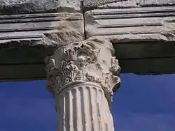 Die Ruinen eines mit Marmor geschmückten Triumphbogens befinden sich am Eingang zur Agora. Das 14 Meter lange und zehn Meter hohe Monument besaß vier Säulen und war durch drei mit Bögen verbundene Tore passierbar.