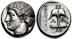 In Apollonia nahm der Kult des Apollon eine zentrale Stellung ein. Ein bedeutender Tempel des Gottes und Namenspatrons wurde bereits zur Zeit der Stadtgründung erbaut[28]; dort befand sich auch das im 2. Viertel des 5. Jahrhunderts v. Chr. von Kalamis geschaffene, 30 Ellen hohe kolossale Kultbild des Gottes aus Bronze.[29] Der Tempel galt dem Apollon Ietros und wird in drei antiken Inschriften erwähnt sowie auf Münzen dargestellt.[30][31] Der Beiname Ietros bedeutet zwar wörtlich Heiler (deutsch: Apollon der Heiler), weist aber laut Manfred Oppermann allgemein auf den beschützenden Aspekt dieser Gottheit hin. Sein Kult ist darüber hinaus in Histria, Olbia und Pantikapaion belegt, lässt sich jedoch nicht außerhalb des Schwarzmeerraumes nachweisen.[32] Der Tempel des Apollon Ietros war gleichzeitig der Haupttempel der gesamten Region, in der weitere kleinere Tempel (wie die Tempel des Apollon Mousagetes (d. h. Apollo als Musenführer) und des Apollon Karneios beim heutigen Burgas) errichtet wurden.[33]