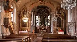 - Sehenswert im Ortsteil Urloffen ist die klassizistische Sankt Martinskirche, entworfen und ausgeführt von Hans Voß im Weinbrenner-Stil. Sie zeigt ein spätes Beispiel des für Baden typischen Klassizismus. Monumental stößt der Kirchturm aus der Vorderseite des Kirchenschiffes in die Höhe. Durchaus untypisch für den Weinbrenner-Stil ist ein gewisser Schmuckreichtum für die Fassaden des Langhauses. Der Baldachin über dem Hochaltar aus dem Jahr 1915 wurde von den Gebrüdern Moroder geschaffen.[9] Die Urloffener Kirche zählt zu den schönsten Kirchen im Stil des Klassizismus in Baden.