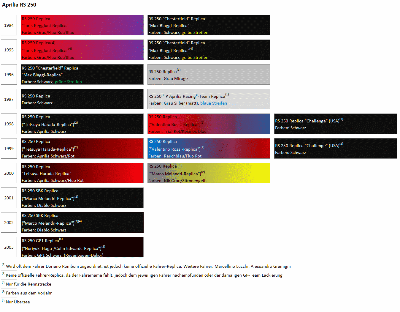 Von der Aprilia RS 250 wurden über die Baujahre 1994 bis 2003 folgende Farbvarianten angeboten:[2][7][6][28]