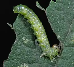 Die bis zu 10 mm lange Larve ist grün gefärbt (Bild 1). Die Kopfkapsel ist seitlich dunkel gestreift, auf dem 2. und 3. Beinpaar befindet sich seitlich ein T-förmiger Makel, die mittleren Segmente des Abdomens tragen seitlich rundliche Aufsätze und das Ende des Abdomens zwei dunkle, kurze Fortsätze.
