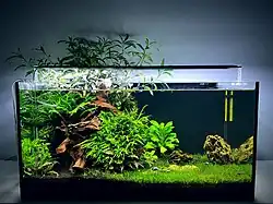 Als Aquascaping bezeichnet man die in der Aquaristik verbreitete Technik des Gestaltens von Aquarienlandschaften. Der ästhetische Anspruch steht hierbei gegenüber traditionellen Biotop-Aquarien im Vordergrund. So werden oftmals Aquarienpflanzen aus verschiedenen Biotopen kombiniert, um ein optisch ansprechendes Gesamtbild zu kreieren. Ziel ist es, „auf engstem Raum eine möglichst makellose Landschaft zu schaffen“.[1] Als gestalterische Mittel werden im Aquascaping hauptsächlich Wasserpflanzen, Natursteine und verschiedenste Wurzelhölzer verwendet. Aquascaping wird daher auch als „Unterwassergärtnern“ bezeichnet. Ursprünglich stammt das Aquascaping aus den Niederlanden, wo es schon in den 1930ern populär war.[1] Geprägt und revolutioniert wurde das Aquascaping unter anderem durch den Japaner Takashi Amano.[2]