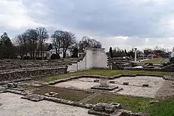 Weitere Ausstellungsräume widmen sich im klassischen Museums-Format der Geschichte und Bedeutung des antiken Aquincum, mit einem Schwerpunkt auf dem Palast des niederpannonischen Statthalters. Zu den ausgestellten Gegenständen gehören Mosaiken und Wandmalereien, Plastiken aus Bronze und Terrakotta sowie Gefäße aus Glas und Keramik.[6] Ein herausragender Fund ist die Orgel von Aquincum, eine tragbare Orgel aus dem 3. Jahrhundert n. Chr. und eine der wenigen erhaltenen antiken Orgeln überhaupt.[7] Im Außenbereich werden unter anderem das Forum der Zivilstadt von Aquincum mit der Basilika (Gerichtshalle), mehrere Thermen, ein Mithras-Heiligtum und eine Markthalle mit rundem Tempelchen im Innenhof präsentiert, daneben einige Wohn- und Geschäftshäuser.[8]