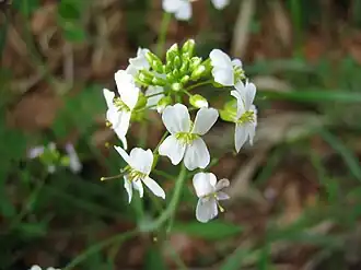 Die Blüten stehen in traubigen Blütenständen zusammen. Die zwittrigen Blüten sind vierzählig. Die vier Kelchblätter sind länglich. Die vier Blütenkronblätter sind in der Form eines Kreuzes angeordnet. Die Farbe der Kronblätter ist meistens weiß, häufig auch rosafarben, selten sogar purpurfarben. Von den sechs Staubblättern befinden sich vier lange in der Mitte und zwei kürzere am Rand. Die zwei Fruchtblätter sind zu einem oberständigen Fruchtknoten verwachsen.