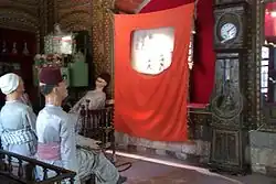 Die Kiste auf der rechten Seite, in welcher die Figuren zu Beginn der Aufführung bereitgehalten werden, bezeichnete der Dichter Ahmad al-Bayrūtī im 13. Jahrhundert als den Mutterbauch, und die Kiste auf der linken Seite, die zur Aufnahme der abgelegten Figuren dient, als den Sarg. Durch diese Metapher erhöhte er das Schattenspiel zur Bühne der Welt.[53] Diese Anordnung verwendete auch Ibn Dāniyāl, der seine Figuren nicht in Kisten, sondern in Körben (safat, Plural asfāt) aufbewahrte.[54] Die Schatten der dünnen Figuren aus getrockneter Tierhaut wurden mit dem Licht einer flackernden Öllampe (fānūs) oder Kerze (schamʿ) gegen einen weißen Vorhang (sitāra, auch sitr, izār oder schāsch) geworfen. Provisorische Bühnen für Aufführungen im Freien benötigten zumindest eine größere Kiste, in welcher der Puppenspieler (muqaddim) unsichtbar agierte. Stationäre Bühnen besaßen einen breiten Vorhang, der Zuschauer und Vorführer trennte. Im 18. und 19. Jahrhundert gab es provisorische Bühnen im Freien auf Marktplätzen, in Kaffeehäusern, gelegentlich in Privathäusern oder in Palästen. Die Schattenbilder wirken nur bei vollständiger Dunkelheit der Umgebung.