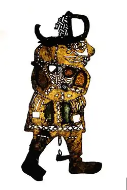 Die osmanischen Figuren des 18./19. Jahrhunderts sind etwa 30 Zentimeter,[55] die älteren ägyptischen Figuren über 60 Zentimeter bis zu halber Lebensgröße hoch.[56] Sie sind aus schwarz gefärbter dicker Tierhaut ausgeschnitten und mit gestrichelten Linien und geometrischen Mustern dekoriert. Bei manchen wertvollen Figuren sind einige ausgeschnittene Flächen mit einer dünneren, bemalten Haut hinterlegt, um durchscheinende, farbige Stellen zu erzeugen. Da die dünnen, farbigen Stellen wesentlich empfindlicher sind, gingen sie bei älteren Figuren häufig verloren. Um 1900 wurden die Figuren mit etwa einem Meter langen Spielstäben (aus den Rippen von Palmblättern) an den Vorhang gehalten. Mit der Spitze stecken die Stäbe in kreisrunden Löchern, die durch beidseitig aufgenähte Lederstücke verstärkt sind, in den Figuren. Sie sind damit in alle Richtungen beweglich. Eine sehr große Figur oder eine Figur mit beweglichen Teilen braucht zwei Löcher zum Fixieren. Bewegliche Teile werden durch Fäden zusammengebunden.[57]