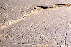 Die Arak-Schlucht weist eine bizarre Felslandschaft auf. Sie wirkt wie nebeneinandergerückte Zyklopensäulen, die mit riesigen Kapitellen die Schlucht säumen.[1] Wenige 100 Meter vor der Felsbastion liegt ein einzelner Felsblock am Rande des Wadis, der Petroglyphen und Tifinagh-Schriftzeichen trägt.