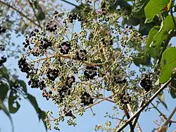 Es bilden sich beerenartige, 3–5 Millimeter große, rundliche, fünfsamige Steinfrüchte (Scheinfrucht) mit Griffelresten an der Spitzen, mit bei Reife tiefblauer bis schwarzer Färbung, die im Winter auch von Vögeln gefressen werden. Die Samen (Steinkerne, Pyrene) sind abgeflacht und etwa elliptisch bis halbmondförmig.
