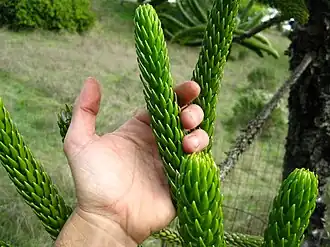An jungen Exemplaren sind die Blätter schuppenartig und besitzen eine spitz zulaufende Spitze. An älteren Exemplaren sind die sich dachziegelartig überdeckenden, schuppenartigen und verdrehten Blätter bei einer Länge von 2 bis 2,5 Zentimeter und einer Breite von 1,1 bis 1,4 Zentimeter lanzettlich mit einer ausgeprägten Mittelrippe. Die Spitze der dunkelgrünen Blätter ist eingekrümmt.[1]