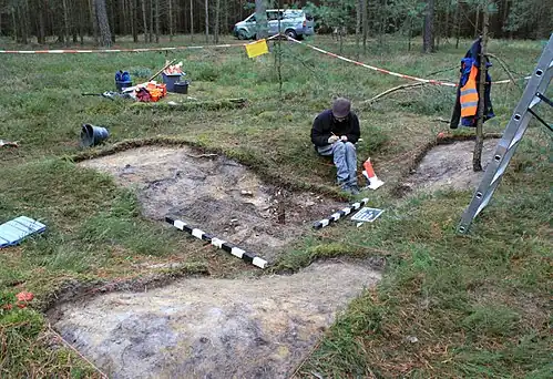 Im Frühjahr 2017 erfolgten die ersten archäologischen Untersuchungen als Prospektionen, bei denen der Bereich des früheren Camps erkundet wurde.[20] Die Standorte der Hütten wurden anhand von entzerrten Luftbildern lokalisiert. Bei Begehungen des Geländes unter Mitwirkung von Sondengängern wurden 450 Gegenstände gefunden, die zu etwa zwei Dritteln aus der Zeit um 1980 stammen. Dazu zählten vor allem Getränkedosen und Kochtöpfe, darunter ein vermutlich bei der Platzräumung platt gewalzter Topf.[21] Ein weit älteres Fundstück war eine mittelalterliche Gürtelschnalle.