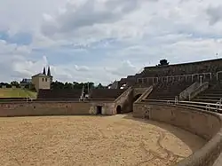 Veranstaltungen Das Amphitheater wurde nicht auf den Originalfundamenten rekonstruiert, da diese nach ihrer Entdeckung 1887 ausgegraben wurden und dadurch dem Wetter ausgesetzt waren. Somit war die Tragfähigkeit nicht mehr gewährleistet. Drei der Originalfundamente der Pfeiler sind heute neben der Arena ausgestellt. Zwischen Arena und Stadtmauer befindet sich auch der Nachbau eines Römischen Baukrans.