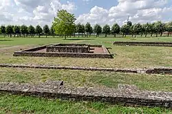 Rekonstruktion von zwei römischen Handwerkerhäusern[14] die Häuser wurden auf Basis der gefundenen Lehmfundamente originalgetreu rekonstruiert, wobei anhand der gefundenen Objekte auch die Inneneinrichtung rekonstruiert wurde. Die Rekonstruktion erfolgt zum Schutz der Originalfundamente auf einer darüber gegossene Betonplatte. Offiziell eröffnet wurden sie am 30. April 2015.[15]