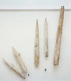 Harpunen (1) und Speerspitzen (2) aus der Steinzeit, gefunden in Engen, ca. 14.000 v. Chr.