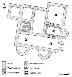 Ausgegraben wurde auch eine römische Villa rustica aus der Mitte des 3. Jahrhunderts mit ihren Nebengebäuden, von denen die Reste eines Badehauses erhalten werden konnten. Aus den Brunnenverfüllungen von zwei Brunnen der Villa wurden Skelettreste von 14 Männern, Frauen und Kindern geborgen, die Spuren von erheblicher Gewalteinwirkung aufwiesen. Dies deutet auf einen Überfall und anschließende Niedermetzelung der damaligen römischen Bewohner durch vermutlich germanische Angreifer hin.