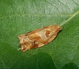Brauner Laubholzwickler (Archips xylosteana) auf einem Eichenblatt | ||||||||||||