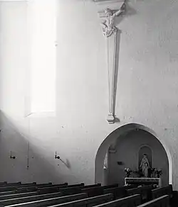Andere Bauten in Sichtbeton sind das am 25. Januar 1964 eingeweihte katholische Gemeindezentrum St. Peter und Paul in der Metzgergasse und die Heilbronner Kreuzkirche, die von R. Krauter und Fritz Holl entworfen und am 6. Dezember 1964 von Landesbischof Erich Eichele eingeweiht wurde. Zudem im Jahre 1966 der Lange Stall ein „markantes“[88] Wohn- und Geschäftshaus in Sichtbeton am Sülmertorbahnhof, nach Entwürfen des französischen Architekten Renaud de Girondon.[89] Weiter die Heilbronner Wartbergkirche, die nach Plänen von Rudolf Gabel im Jahre 1967 fertiggestellt wurde. Ebenso die am 9. Dezember 1973 eingeweihte Pauluskirche. Andere Bauten mit Sichtbeton sind die am 22. Dezember 1974 eingeweihte Frankenbacher Johanneskirche sowie die Biberacher Böllingertalhalle und die Kirchhausener Deutschordenshalle. Zudem die am 12. Dezember 1975 eingeweihte Horkheimer Stauwehrhalle.[90]